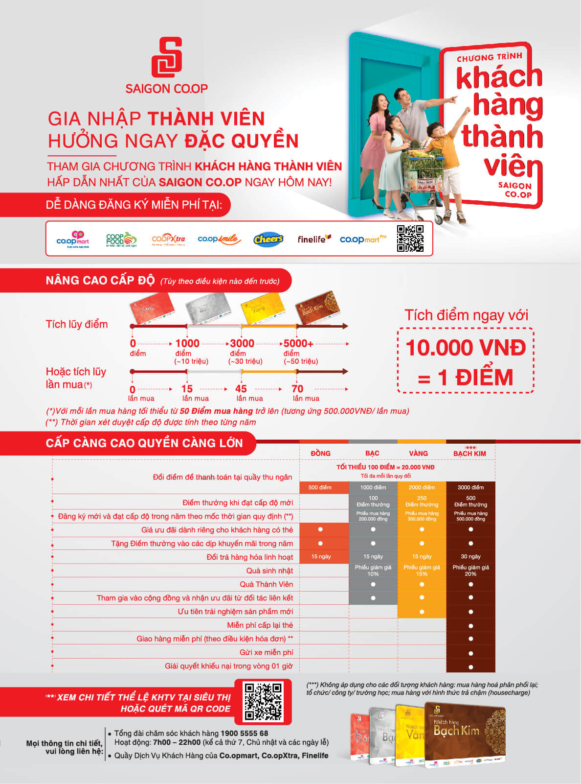 - Căn cứ vào tình hình thực tế với mục tiêu nâng cao giá trị ưu đãi Thành viên, Saigon Co.op có thể linh hoạt điều chỉnh thể lệ Chương trình KHTV và thông tin đến Thành viên vào thời điểm áp dụng.