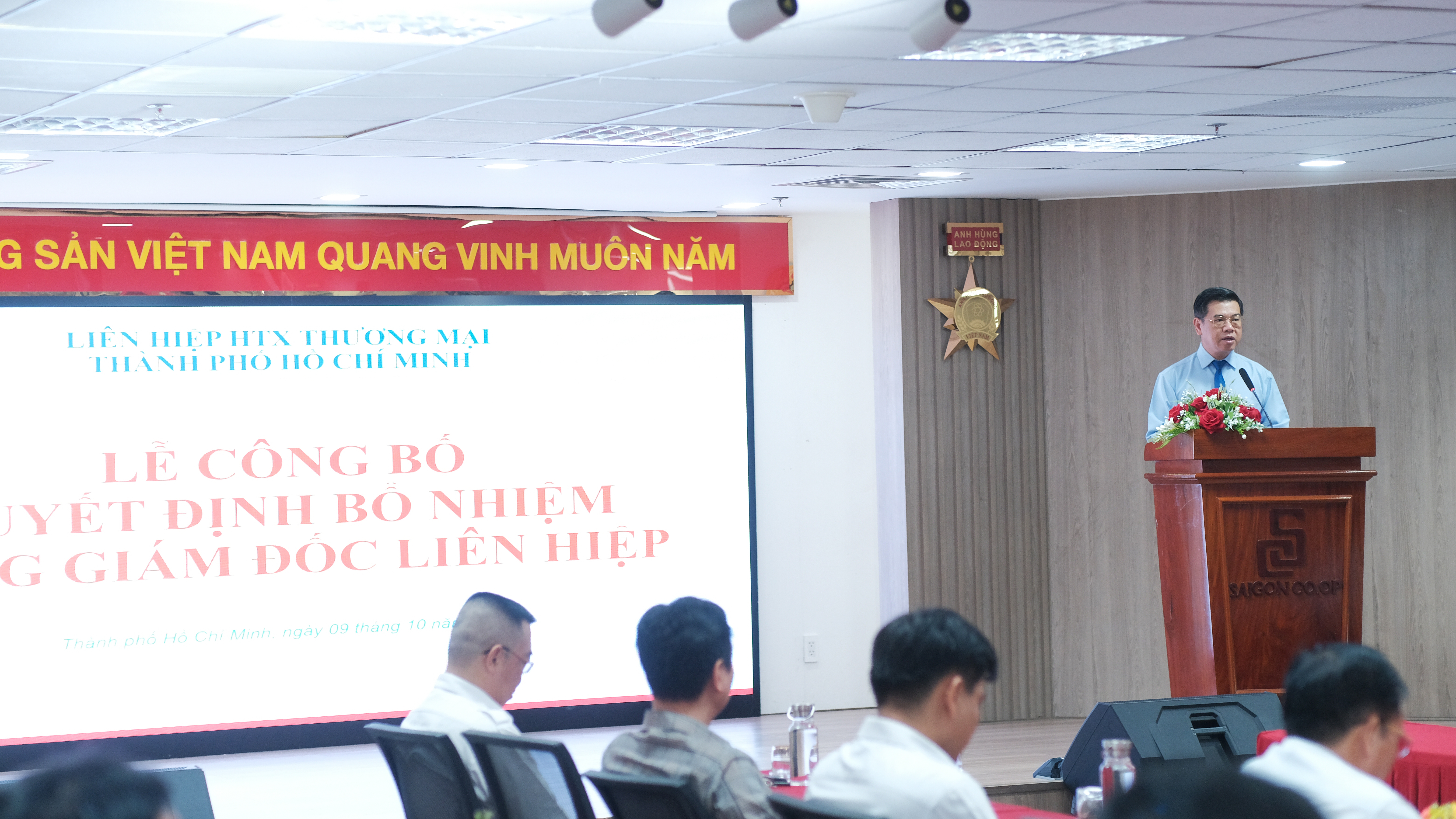 Căn cứ Quyết định số 110/QĐ-HĐQT của Ban Thường vụ Đảng ủy và Hội đồng Quản trị Liên hiệp Hợp tác xã Thương mại Thành phố Hồ Chí Minh, sáng ngày 9 tháng 10 năm 2025, tại hội trường Liên hiệp Hợp tác xã Thương mại Thành phố Hồ Chí Minh (Saigon Co.op), đơn vị đã long trọng tổ chức Lễ công bố Quyết định bổ nhiệm đồng chí Phạm Trung Kiên – Đảng ủy viên Đảng ủy Liên hiệp, Phó Tổng Giám đốc Saigon Co.op, Tổng Giám đốc Công ty Cổ phần Đầu tư Phát triển Sài Gòn Co.op – giữ chức vụ Tổng Giám đốc Liên hiệp Hợp tác xã Thương mại Thành phố Hồ Chí Minh (Saigon Co.op)..JPG)